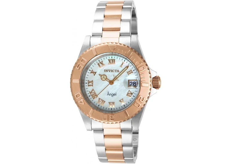 This impressive Invicta Angel watch features a precise Quartz movement as well as a rose gold, steel case. Its white, mother of pearl dial is enclosed by a highly protective Mineral Crystal. This watch is finished by a strong steel, rose gold, stainless steel band, and it offers 200 m water resistance. Patterns of ethereal energy connect time to a higher plane with the Invicta Angel collection. Harmonizing a perfect balance between time and style, watches of graceful diversity comprise Angel. Designed with a touch from above, Angel offers an array of selections to satisfy any mood, occasion, or taste. Highlighting the aspects of feminine prowess, the Invicta Angel collection knows no bounds, transcending earthly planes and achieving the ideal in keeping time. From Invicta's founding more than a century ago to the present day, innovation and excellence have been at the core of each era and collection throughout the brand's history.