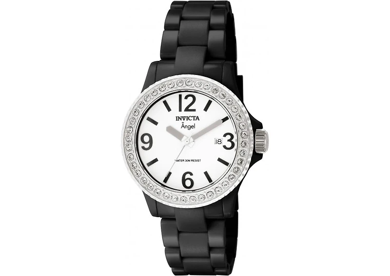 Invicta 1633 Angel collection women's watch features a 39mm wide and 12mm thick black plastic case with stainless steel textured crown and crystal accented bezel. Invicta 1633 is powered by an accurate Swiss Ronda 505 quartz movement. This beautiful watch also features a milky white dial with gunmetal tone hands and black hour markers, date display function, protected by scratch resistant mineral crystal and water resistant to 30 meters. Invicta 1633 is equipped with a 20mm wide black plastic bracelet with fold over clasp.