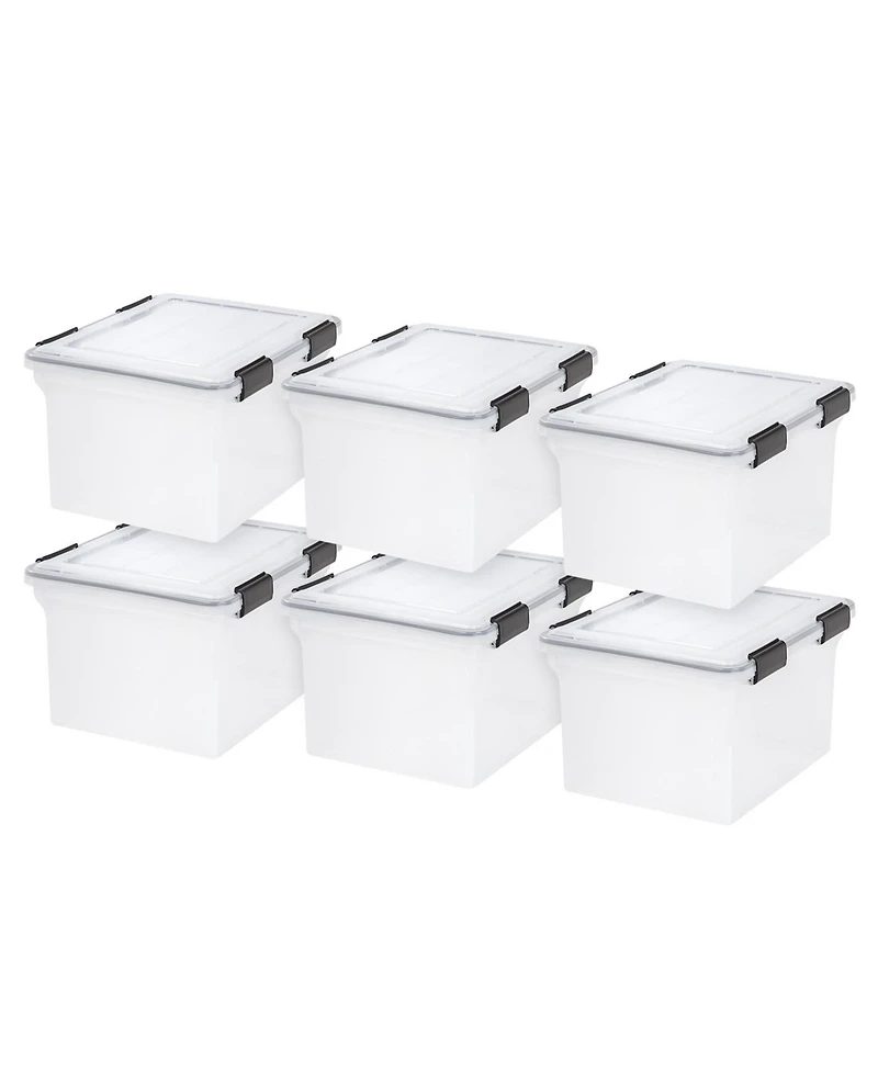 Iris 32-quart Weathertight large plastic storage box is a durable, protective storage solution for your valuables and important documents. These Weathertight letter / legal sized file boxes will keep your papers and documents safe, clean, and moisture-free. Four heavy-duty buckles keep the storage bin lid securely in place while the clear plastic container allows you to easily see your stored items. The reinforced tote boxes with lids are easily stacked together so you can maximize your storage space. Made in the Usa.