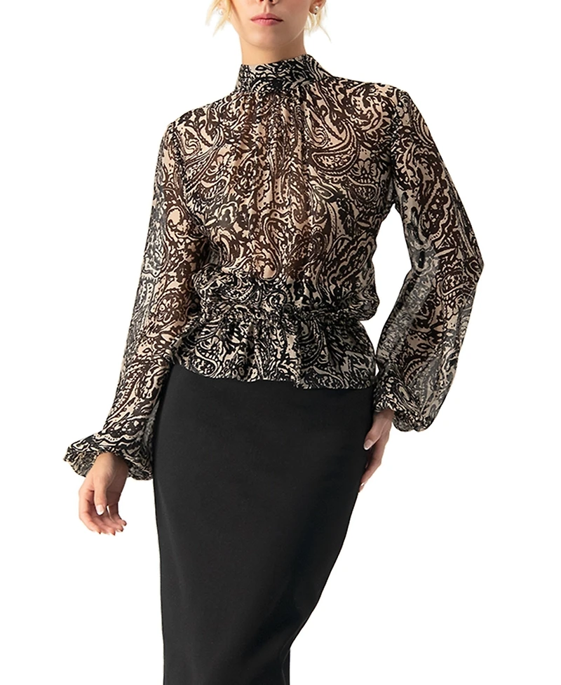 Long sleeve high neck blouse with a stylish paisley see-through print, perfect for any occasion.