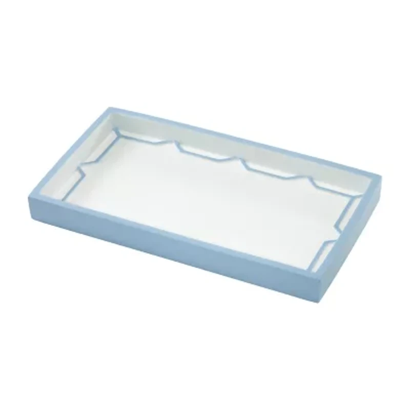 The Izod Trellis Decorative Vanity Tray features a rectangular, white body with medium blue trellis details and outside edge for a clean, modern look. Crafted of hand-painted sand resin that gives it a sparkle along with solid feel, easy care and durability. Measures W 5.63" x L 10.13" x H 1". Other matching accessories are also available. Shop for the entire Izod bath collection of shower curtains, towels, rugs and bath accessories.