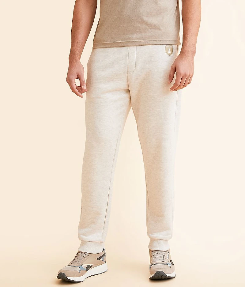 Embroidered patch heathered fleece lined jogger Inseam measures 31" Elasticized interior cinch tie waistband Faux fly