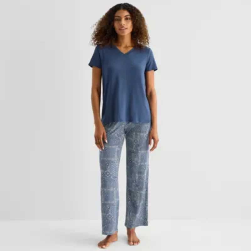 Made from soft stretch-knit, this 2-piece women's pajama set by Jaclyn will keep you comfy through all of your sweet dreams. The combo includes a V-neck short-sleeve top and a printed pull-on pants with an elastic-waist and side pockets.