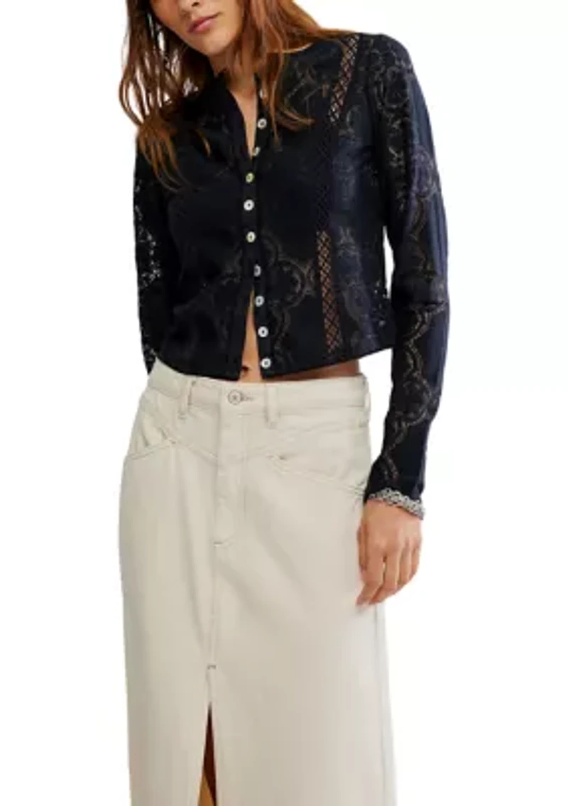 Add a dainty touch to your look with this sheer cotton-lace long sleeve from Free People, featured in a button-front style for a versatile piece that’s perfect for layering. Crew neckline Button-front closure Fitted long sleeves Imported Product Specifications 21.5" L Material & Care Cotton, nylon, elastane Hand wash
