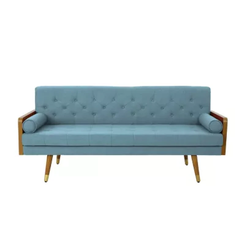 Anchor your living room in sophisticated style and impeccable comfort with a single addition. Perfectly balancing wood accents with fabric upholstery, our impressive sofa set offers your home a charming mid-century modern upgrade. This piece offers a beautiful button tufted design that is finished with diamond stitching on the backrest and waffle stitching in the seating. Completed with iconic splayed legs with gold tips and lovely bolster pillows, this refined sofa will make any interior space into a stunning masterpiece.