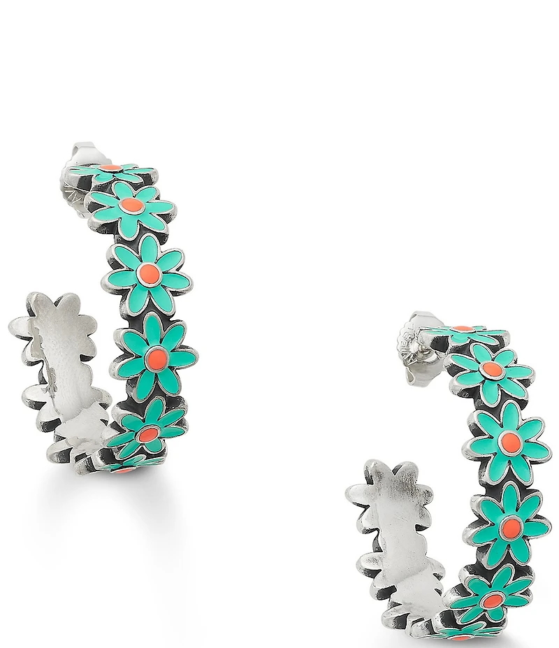 From James Avery, these earrings feature: The Enamel Floral Hoop Earrings expand our Enamel Mini Flower Collection, bringing even more color, joy and playfulness to any look. These sterling silver hoop earrings feature a daisy-chain of pastel blooms to brighten any day or outfit, symbolizing friendship and carefree moments. Choose between two sizes of hoops to wear solo or layer in an earring stack. The colorways and design match back to the charm, ring and stud earrings in the Mini Flower Collection. Sterling silver Pink and yellow, purple and coral, light teal and coral or white and yellow enamel Large is approx. 1" L Post closure Crafted in America using the world's finest materials.