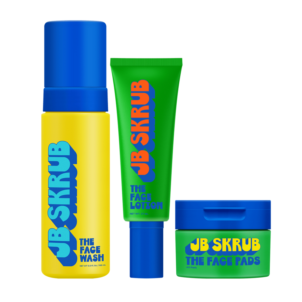 Complete Face Care Set for Tweens and Te. Benefits: Complete 3-step teen face care system Cleanse, hydrate, and treat in one bundle. Helps targets teen breakouts Multi-step approach to clearer, healthier skin. Simple & fast routine Easy skincare that busy teens will actually follow. Clean ingredients Free from harsh chemicals, parabens, and sulfates. Infused with prebiotics to help support skin's natural protective barrier. Includes: JB SKRUB Face Wash (5 oz) - Gentle face wash for teens that cleanses without over-drying. This pH-balanced teen face cleanser removes dirt, oil, and sweat while maintaining skin's natural moisture barrier - and is especially safe for sensitive skin. Aloe Vera helps soothe, Chia Seed provides Omega 3 & 6, while Green Tea offers antioxidants. Willowherb helps defend and nourish for clear, healthy skin. Yuka Rating - 93/100, Excellent. JB SKRUB Face Lotion (1.7 oz) - Lightweight, oil-controlling teen face moisturizer that hydrates without clogging pores. This non-greasy face lotion for teens keeps skin balanced and prevents the over-drying that can trigger more breakouts. Features Chlorella Vulgaris (Algae) known to protect against blue light. Aloe Vera, Chia Seed, Willowherb, and Niacinamide help deliver exceptional hydration and oil control. Yuka Rating - 100/100, Excellent. JB SKRUB Face Pads (40 pads) - Convenient and gentle toner pads for tweens and teens that cleanse, tone, and help prevent breakouts in one easy step. Perfect for quick skincare touch-ups after sports, between face washing, or when traveling. Infused with Succinic Acid, Aloe Vera, Niacinamide and Willowherb to deliver a targeted solution for blemish-prone skin. Yuka Rating - 100/100, Excellent. Formulated Without: No Synthetic Fragrance. Sulfate Free. Paraben Free. Silicone Free. Phthalate Free. Gluten Free. Cruelty Free. Formulated without over 2,000 ingredients to meet strict EU standards.
