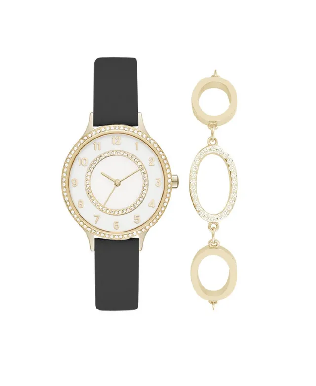 Jessica Carlyle Women's Analog Black Strap Watch 34mm with Gold-Toned Cubic Zirconia Crystal Bracelet Gift Set