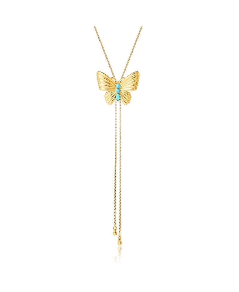 A delicate Y-lariat silhouette dotted with butterflies and a pop of green crystal brings soft femininity and on-trend layering energy. Adjust the drop to frame tees or V-necks.