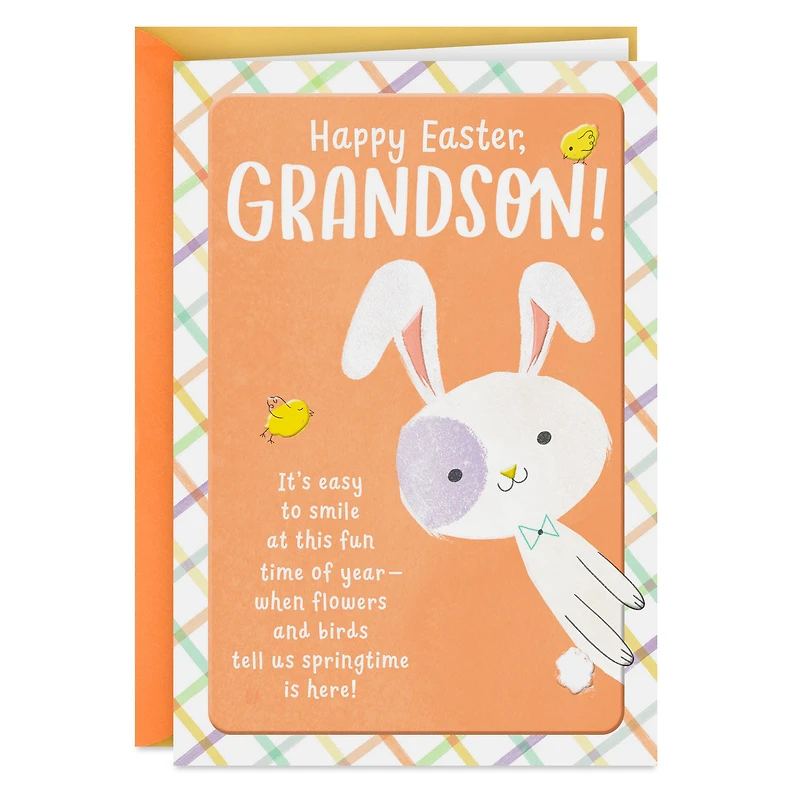 DaySpring Easter greeting card for grandson features a charming illustration of a white and gray bunny with baby chicks on an orange background with embossed accents and a pastel plaid border. The cute, rhyming message pairs with a Bible verse inside.