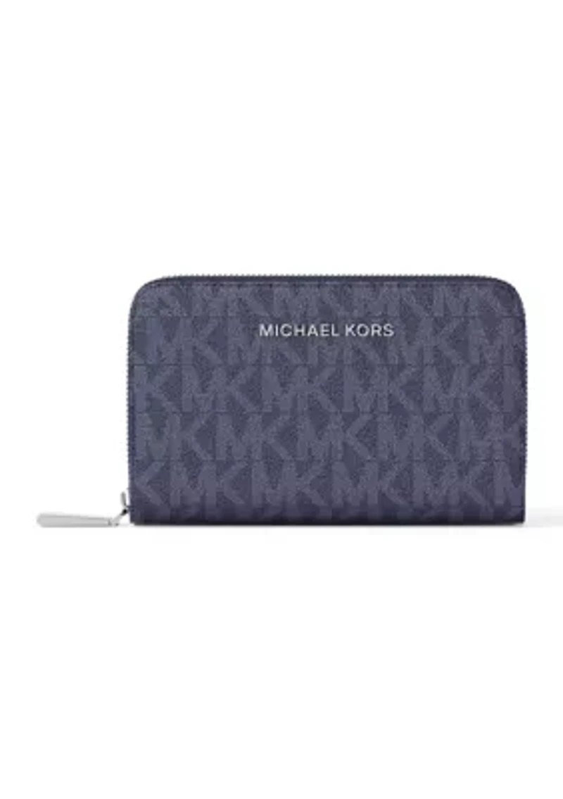 Keep all of your credit cards safe and secure on the go with this card case featuring the signature MICHAEL Michael Kors logo. Zip closure Exterior: 1 back slip pocket Interior: 2 back credit card pockets, 1 center credit card pocket, 2 front credit card pockets Imported Product Specifications 5" W x 3.25" H x 0.75" D Material & Care PVC Clean with a soft cloth