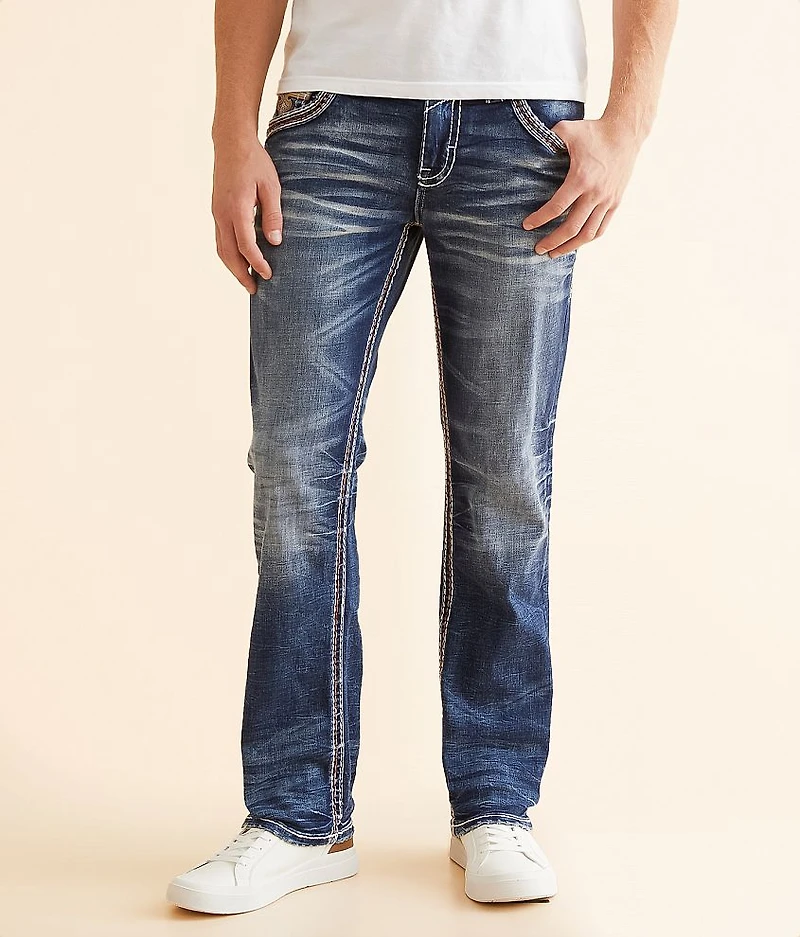 Regular fit jean Comfort stretch fabric Straight from knee to hem Low rise, 16 1/2" bottom opening Color pop stitch embroidery on faux flap back pockets Destruction details Zip fly