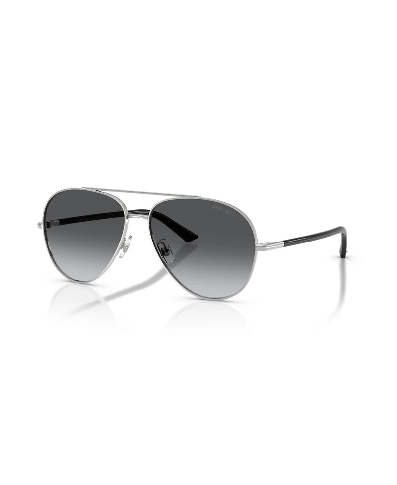 Effortlessly chic, the Jimmy Choo JC4026 sunglasses exude modern luxury with their streamlined pilot-shaped frames crafted from lightweight metal. Finished with a sleek silver hue and gradient grey polarized lenses, they combine understated elegance with advanced glare reduction for improved clarity and contrast. Metal diamond temple studs and adjustable nose pads add signature style and customizable comfort.