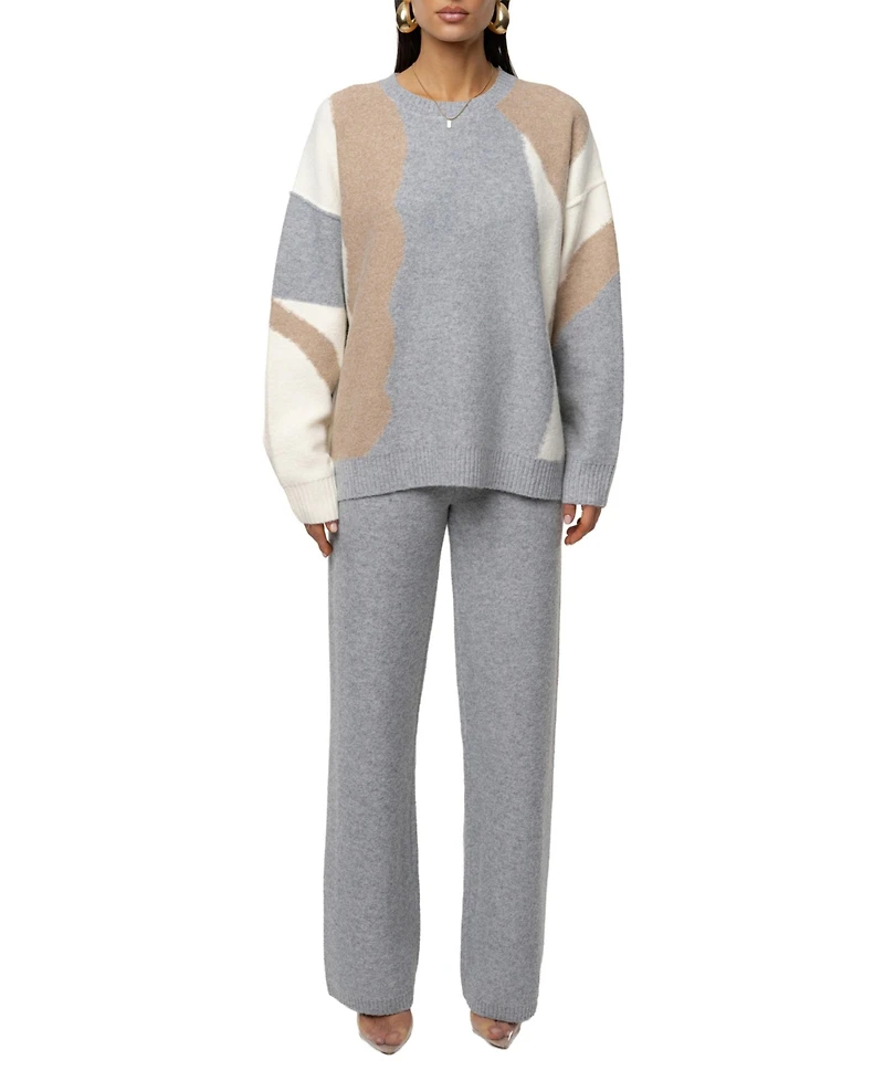 Reimagine your cozy wardrobe with artful sophistication in our Emelie Knit Pant Set. Showcasing a stunning tunic-length sweater featuring an abstract color-block pattern in soft neutral shades. Paired with matching elastic waistband pants in a relaxed straight-leg cut. Its soft knit fabric offers comfort that feels as good as it looks. Whether you're lounging at home or stepping out for a coffee run, this piece is perfect for the season. Stretchy. Sold as set.