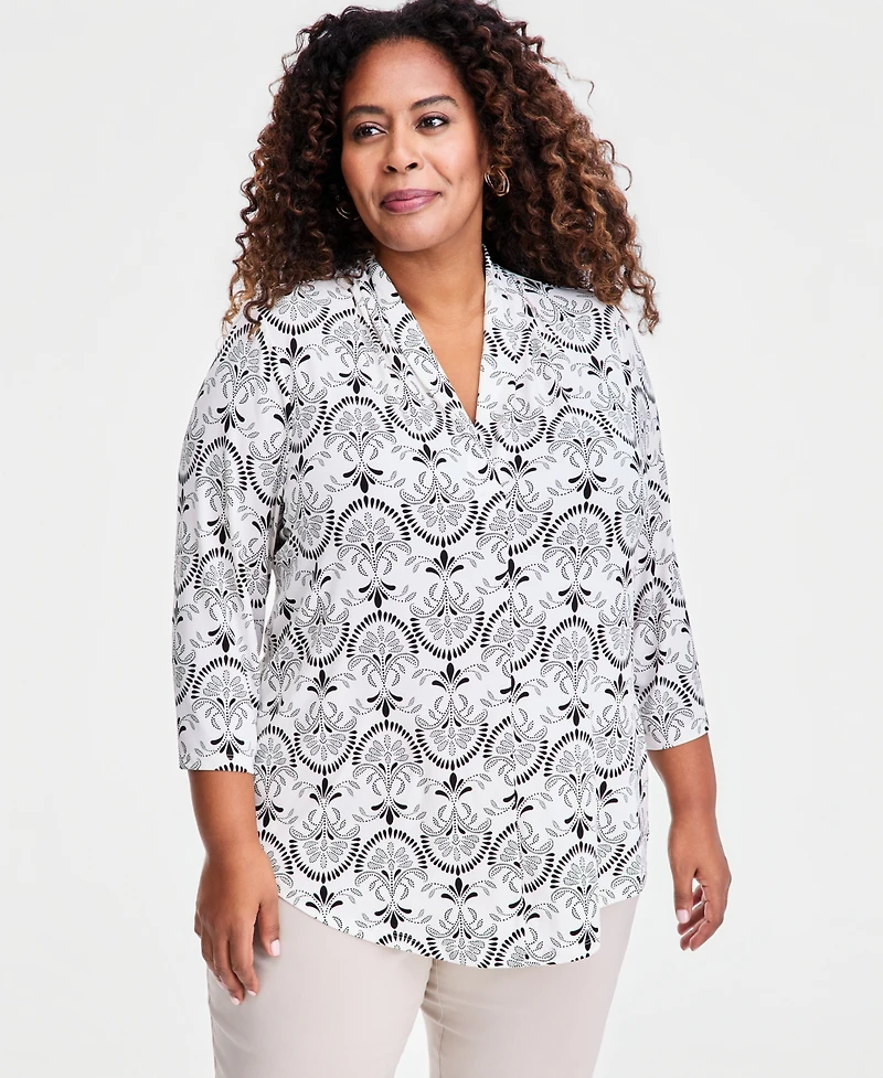 Jm Collection Plus Printed V-Neck 3/4-Sleeve Top, Macy's Exclusive
