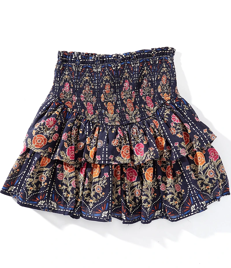 From J.Marie, this skirt features: Torian floral print Elastic waistband Ruched detail Tiered skirt Pull-on styling Lined. approx. 14" length Cotton Dry clean only Imported.