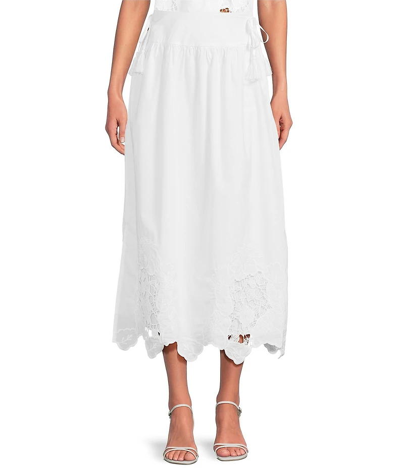 From J.Marie, this skirt features: Cotton fabrication Midi length Elastic waistband Adjustable ties on side Lined Lace embodied details Pullup construction Approx. 36.5" length Dry clean only Imported.