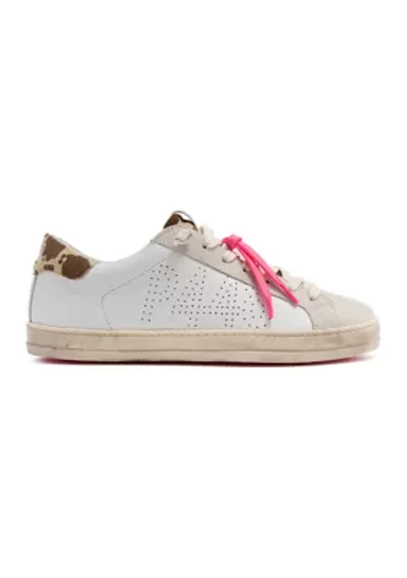 The John sneaker from P448 combines solid leather, cow print and suede for a playful yet refined look. A perforated logo adds a subtle signature touch, while the premium materials deliver everyday comfort and standout style. Tie closure Memory foam insole Imported Product Specifications Medium width Material Lining: cotton & polyester; Midsole: 42% synthetic fibres, 12% polypropylene reinforcement, 43% synthetic resin; Outsole: thermoplastic rubber; Uppfer fabric: leather Calf leather