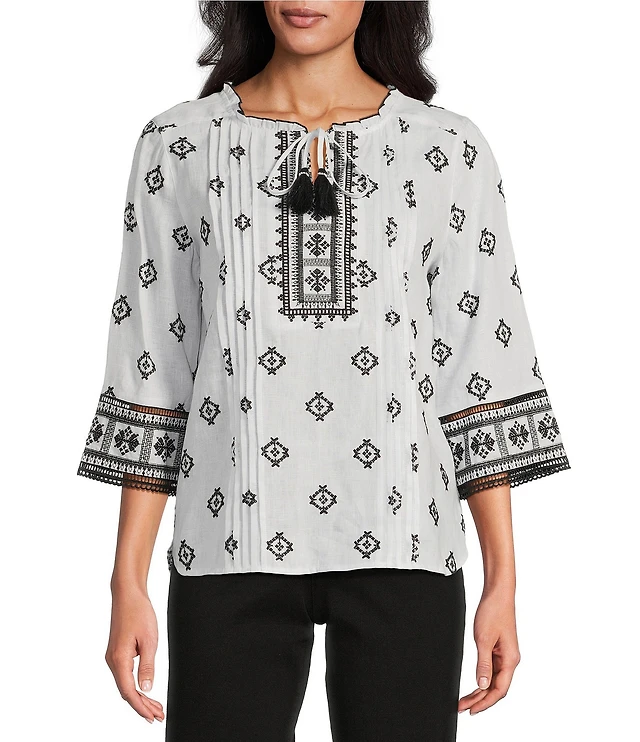 John Mark Allover Embroidered Split V-Neck 3/4 Sleeve Tassel Tie Tunic