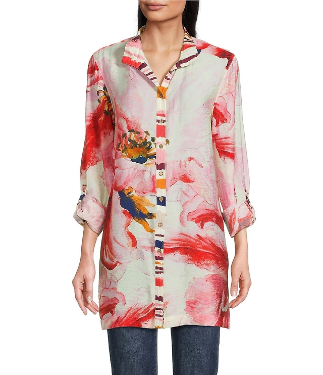 John Mark Point Collar Button Front Long Roll-Tab Sleeve Embroidered Panel Multi Print Tunic