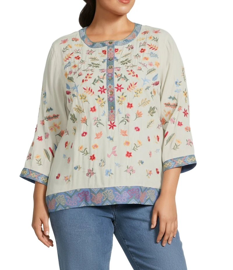 John Mark Plus Size Embroidered Banded Collar 3/4 Sleeve Tunic in Franklin, TN