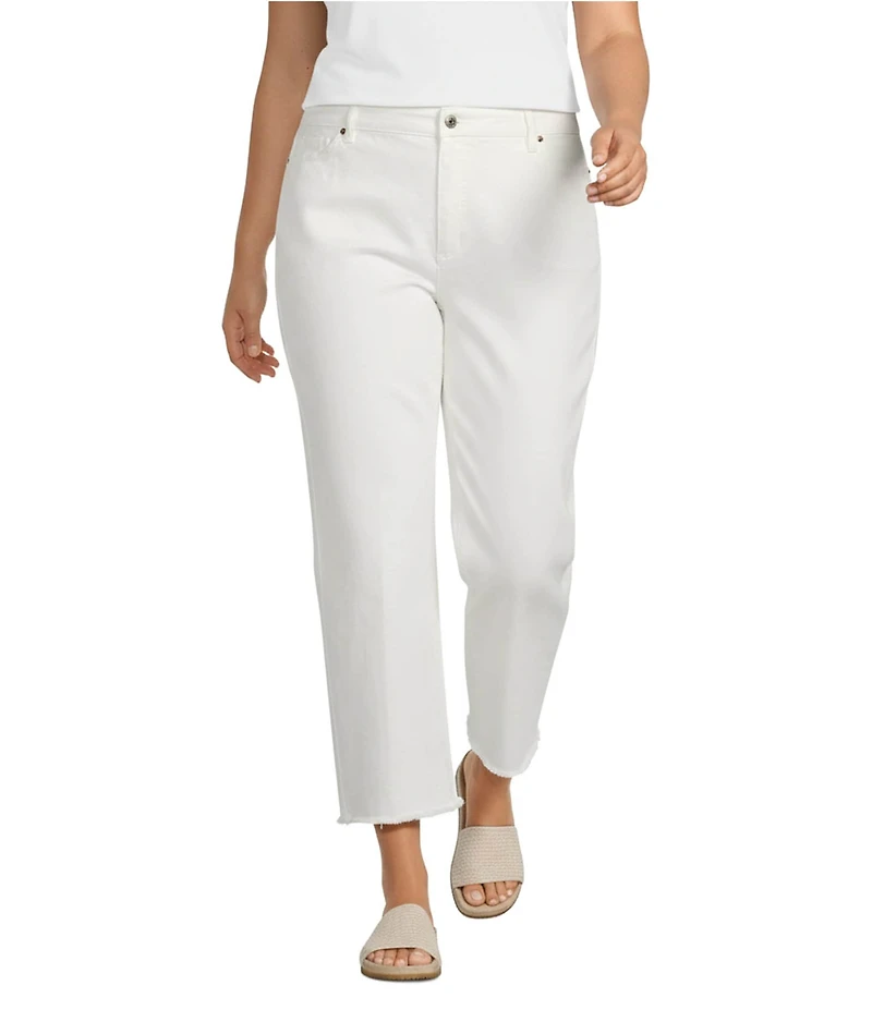 From John Mark Plus, these pants features: Wide-leg Belt loops 5-pocket styling Fringe detail at hem Button/zip closure Approx. 26" inseam Cotton/polyester/spandex Machine wash Imported.