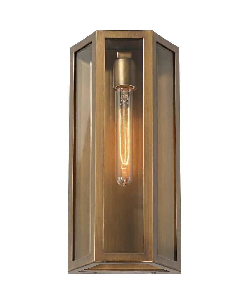 Strong, bold lines create a timeless sense of traditional appeal in the Cecily wall light from the John Timberland brand. Wet location rated, this confident fixture is suited for outdoor and indoor use alike, ready to light up your foyer, porch, patio, hallway, or even traditional style inspired dining and living rooms. An aged brass finish creates a feeling of vintage excellence, with clear glass panels allowing for an exposed bulb look, showcasing the tube bulb housed within. With a geometric design featuring sturdy rectangles and eye-catching angles, the Cecily exterior wall lamp is an ideal choice.