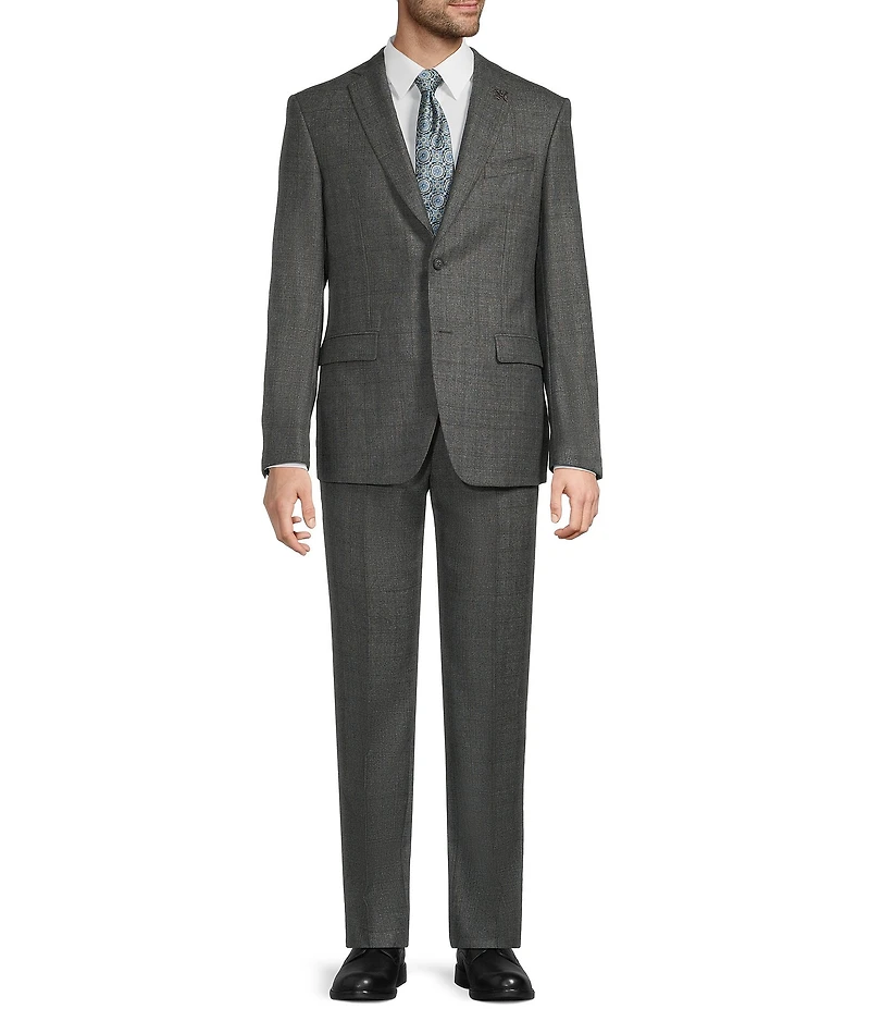 From John Varvatos, this 2-piece suit features: Jacket: Slim fit Notch collar Long sleeves Flap pockets Side vents Plaid pattern 2-button front closure Wool Dry clean Pants: Flat front Plaid pattern 4 pockets Button/zip front closure Wool Dry clean Imported.