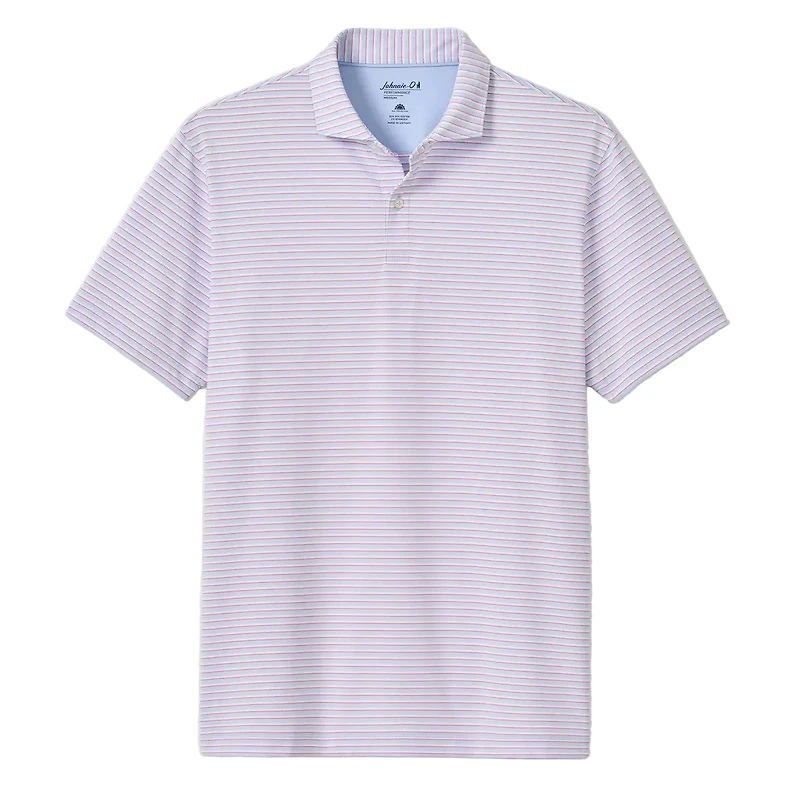 Johnnie O's REZ polo is the go-to shirt for guys who refuse to compromise on comfort or style. Built from a lightweight, moisture-wicking performance jersey with 4-way stretch, it keeps you cool and moving freely whether you're on the course or grabbing lunch. The striped design pairs perfectly with the embroidered logo on the back yoke, while UPF 50 protection shields you from the sun. Side vents and an open left chest keep things breathable, and the wrinkle-resistant fabric means less time ironing and more time living. Easy care, serious performance—this is the polo that actually earns its place in your rotation.