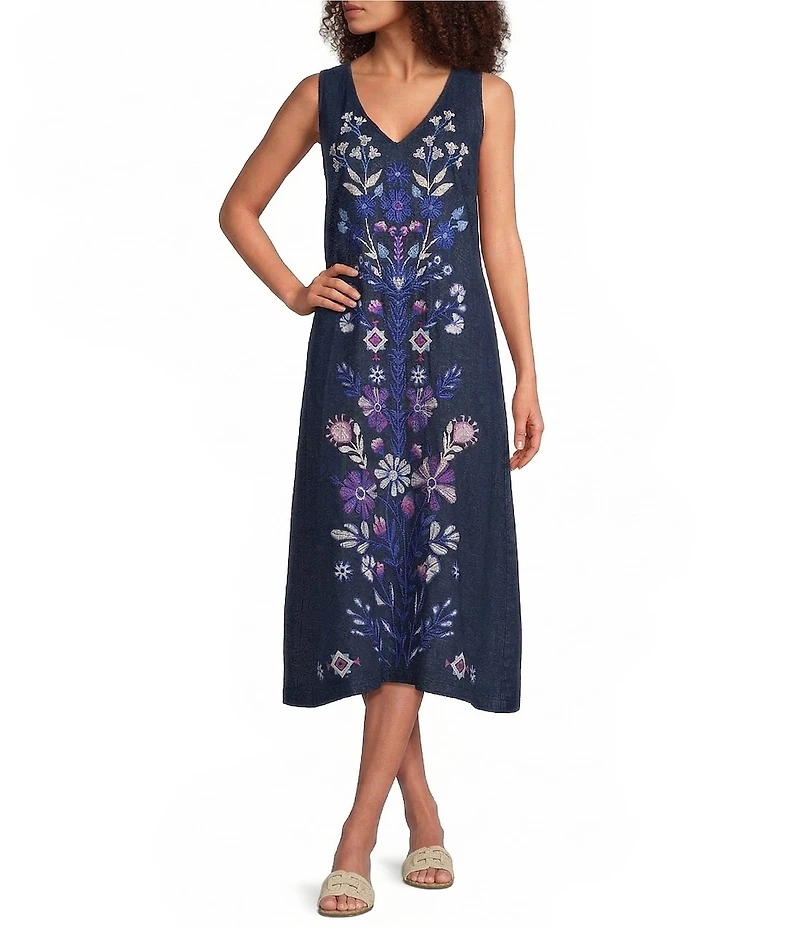 JOHNNY WAS Adina Floral Embroidered Linen V-Neck Sleeveless A-Line Midi Dress in Franklin, TN