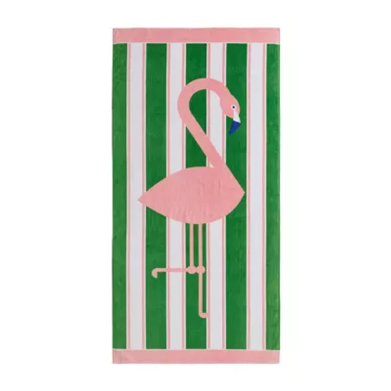 Brighten every summer adventure with the Jonathan Adler Flamingo Beach Towel, a must-have designer beach towel and essential luxury summer accessory. Crafted from 100% premium cotton, this oversized cotton beach towel delivers exceptional softness, durability, and high absorbency, drying quickly after swimming or poolside fun. Featuring bold green and white stripes accented with subtle pink pinstripes, this towel showcases a large, vibrant pink flamingo for a Palm Beach-inspired pop of color. Coordinating pink borders at each end complete the stylish look, while the reversible design offers a plush velour front for lounging comfort and a fast-drying terry loop back for superior absorbency. Perfect for beach trips, pool days, spa retreats, or resort vacations, this towel combines fashion-forward design with effortless care-simply machine wash to keep it looking bright, fresh, and luxuriously soft all season long.