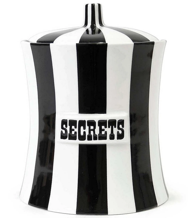 From the Vice Collection by Jonathan Adler, this canister features: Jonathan Adler iconic canisters show off your indulgences, from sweets to sedatives, in irresistible hues. Porcelain Gloss glaze finish Hand-painted graphic SECRETS with vertical black and white stripes Removable gasket sealed lid Perfect piece for your countertop Hand wash recommended. Approx. 6.5 W x 7.75" H Capacity 62-oz. Imported