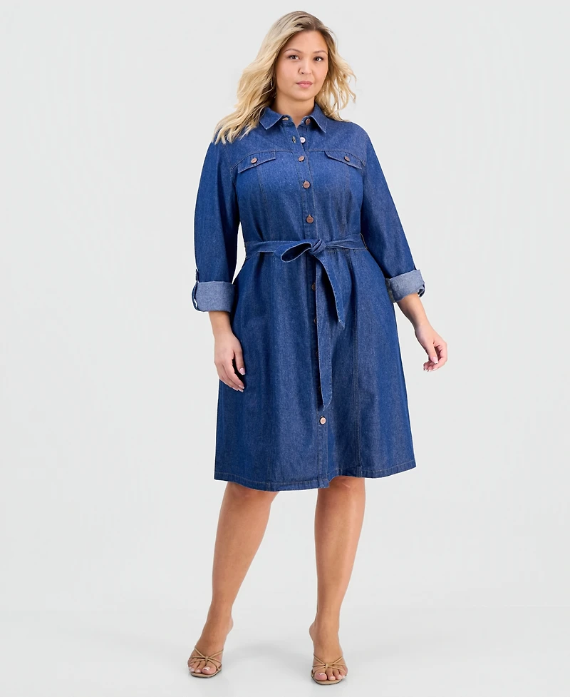 Jones New York Plus Cotton Tie-Waist Chambray Dress