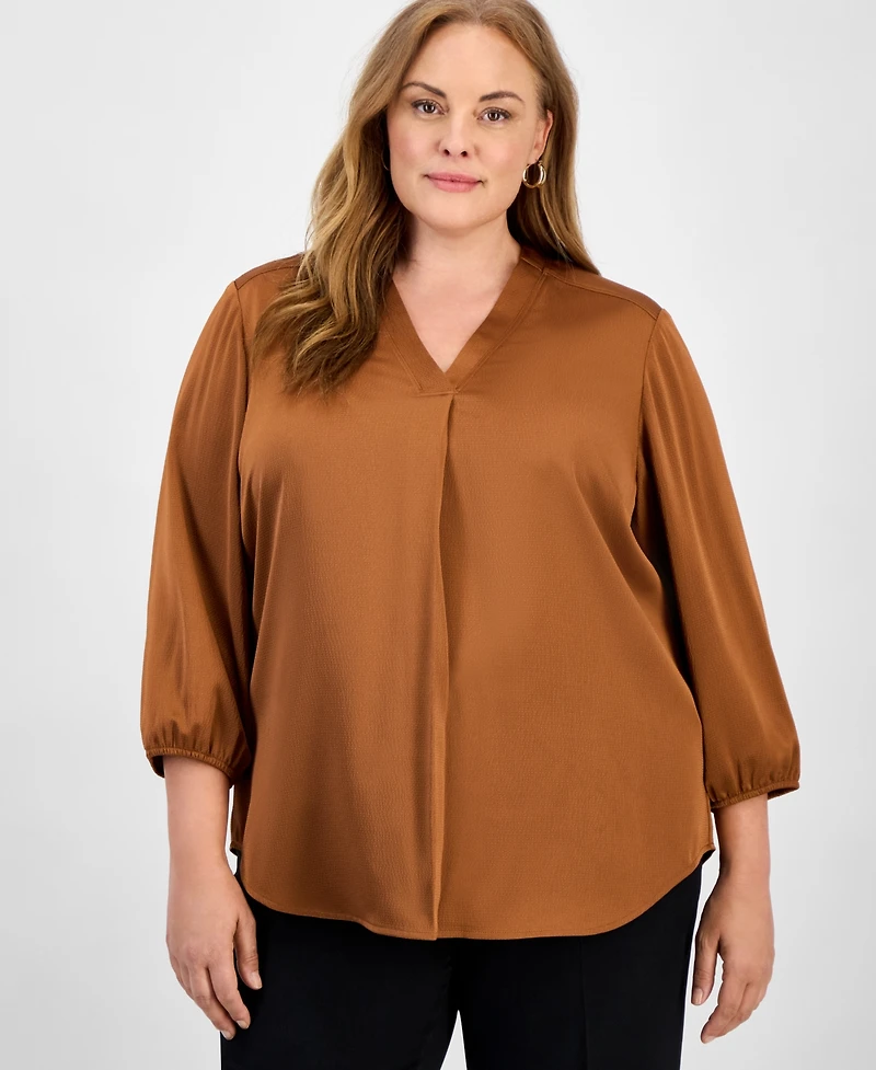 Jones New York Plus Size Satin 3/4-Puff Sleeve V-Neck Blouse