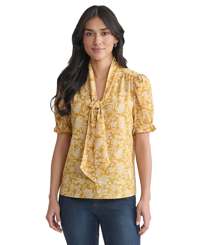 Jones New York Floral Tie Neck Short Puff Sleeve Blouse