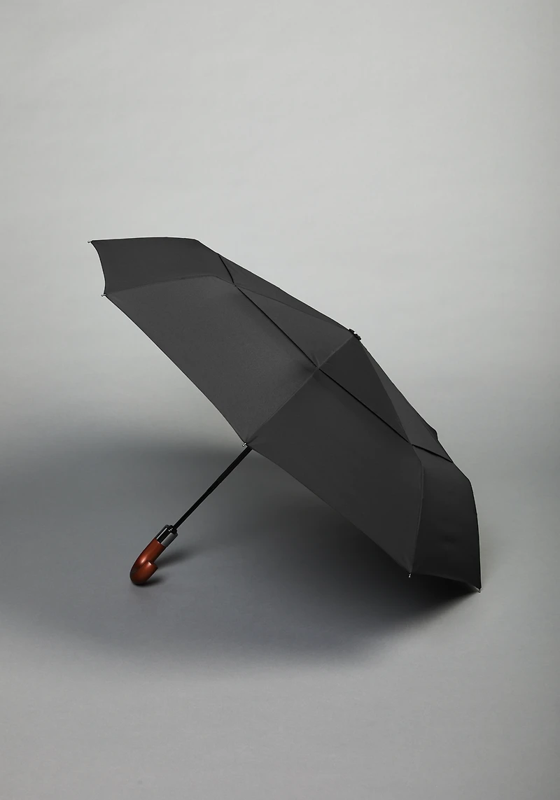 Be prepared for the storms ahead with this rugged umbrella from Jos. A. Bank. It features a 46 inch arc, three-section shaft and auto open and close. It measures 14.5 inches in length when closed. Its vented canopy is engineered to resist windy conditions. Fiberglass end ribs with steel shaft. Curved wood handle. Tie strap. Fabric case. 100% polyester. Imported.
