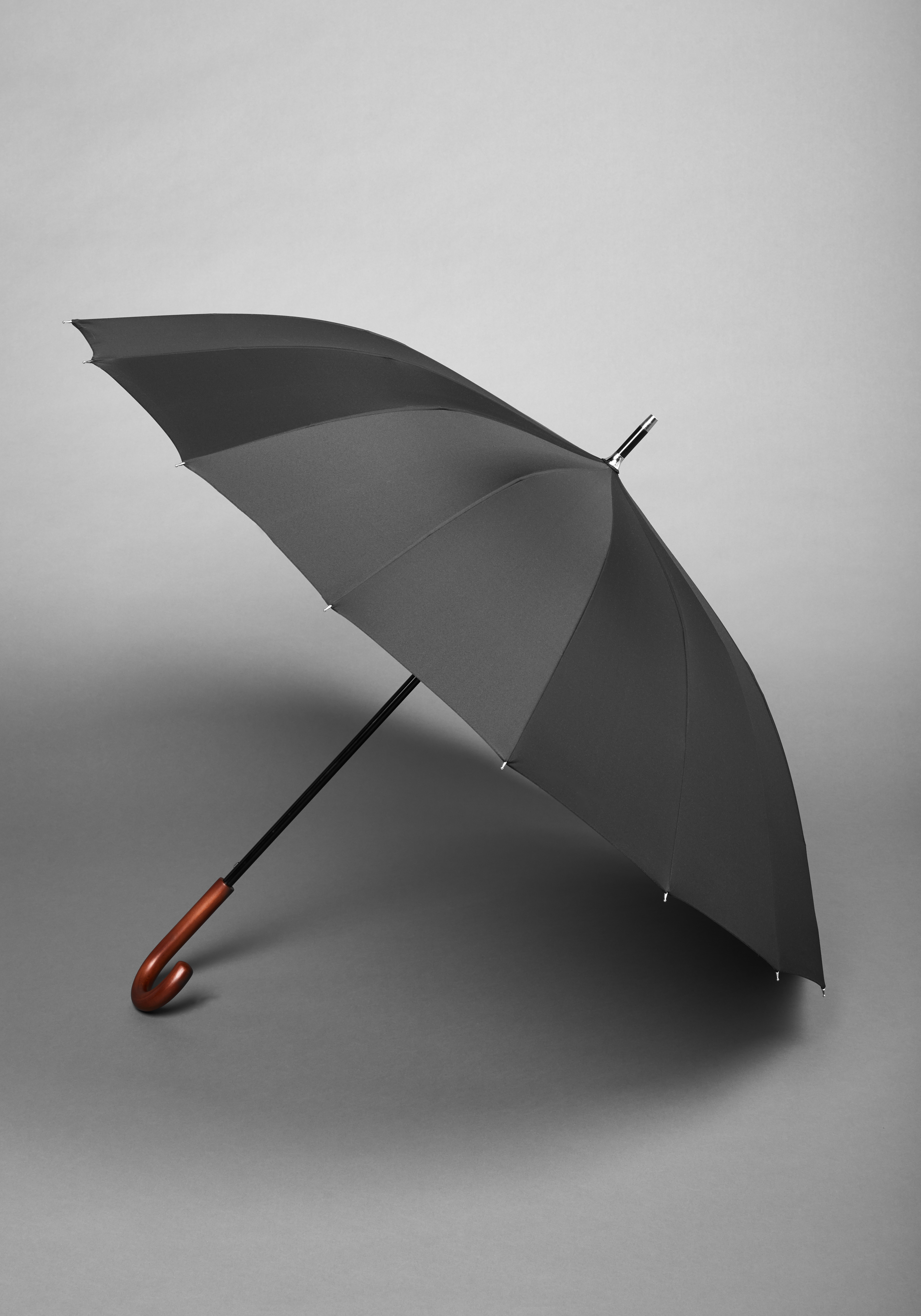 This classic umbrella features a curved wood handle, 16-rib/panel construction, and a metal tip and collar on the ferrule. It has an ample 55-inch arc and is conveniently auto open. Closed, it measures 40.5 in length. Tie strap. Fabric case. 100% polyester. Imported.