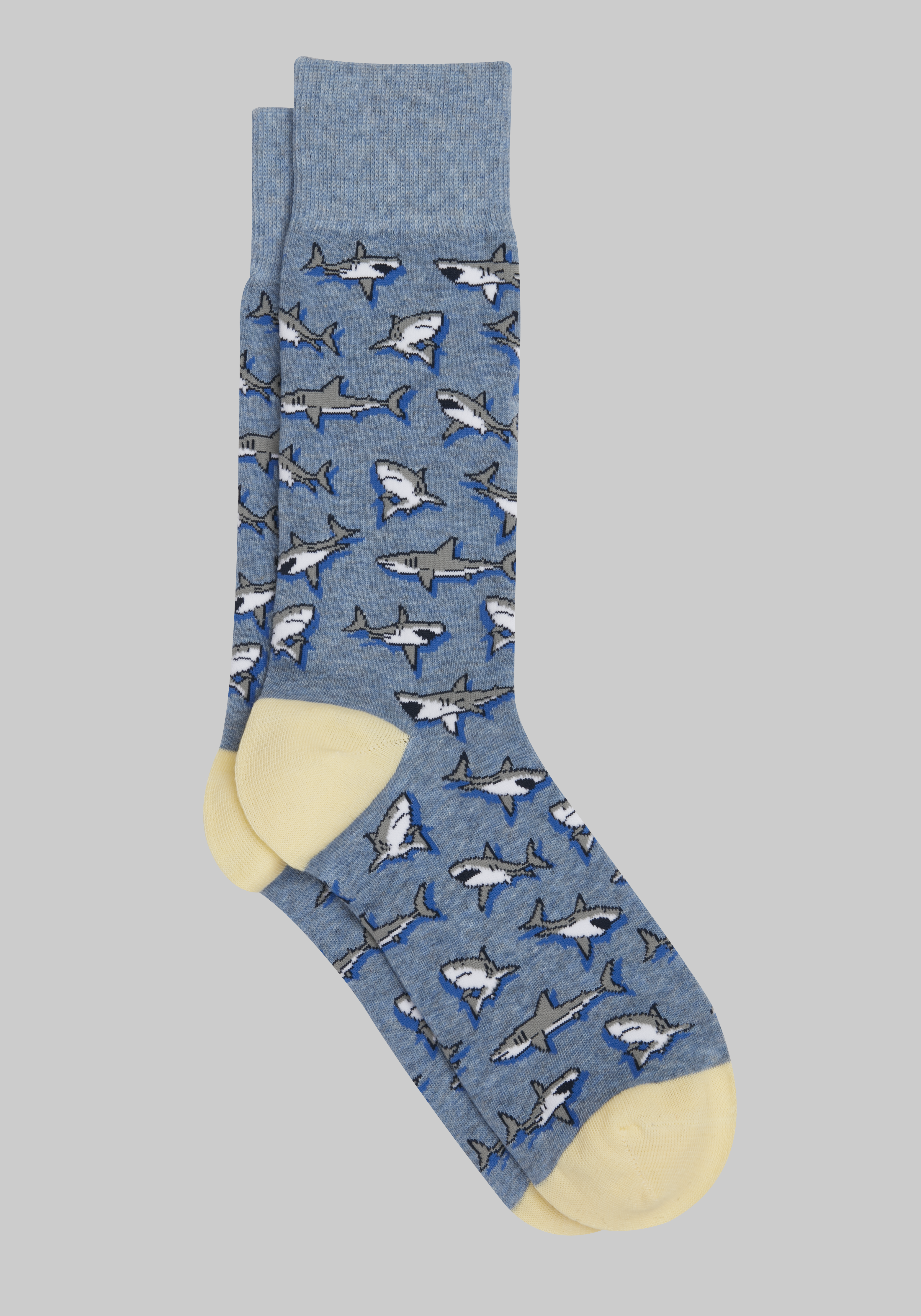 Add some jaw-dropping style to your look with these Jos. A. Bank shark socks. Cut from a soft, combed cotton blend, their natural weave promotes airflow and movement while a bit of spandex offers a great fit. Reinforced at the heels and toes, these comfy mid-calf socks will have you feeling fin-tastic.