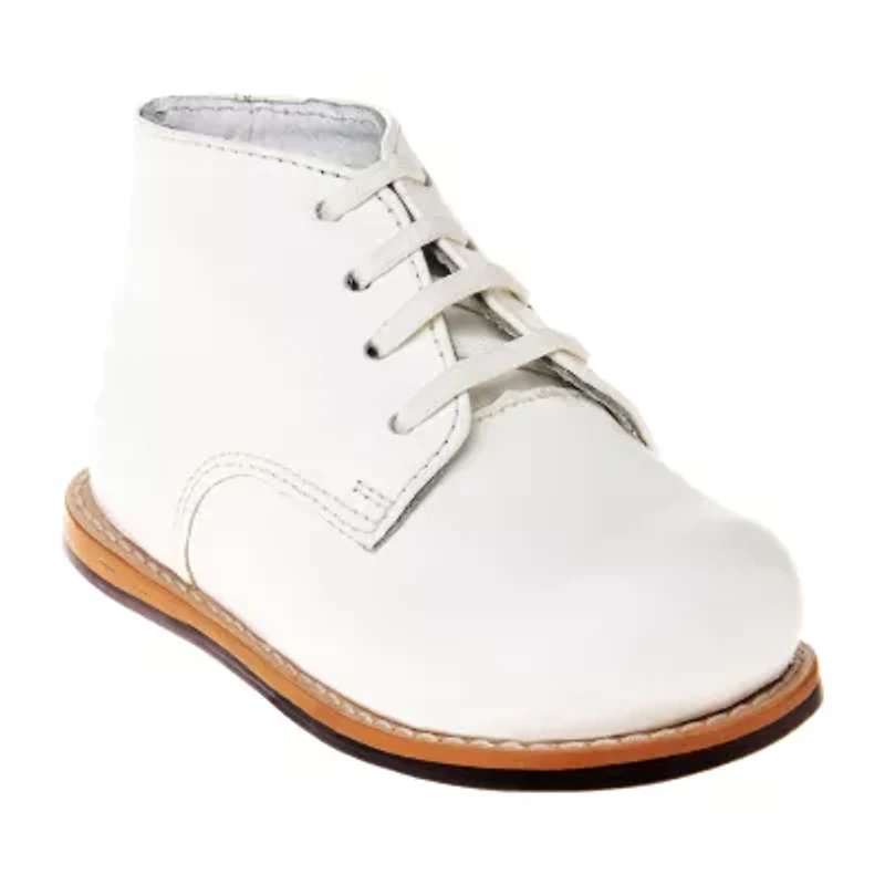 Protect your little ones feet out in the world as they take their first steps wearing this leather pair of unisex baby chukka boots from Josmo. They have a cushioned insole, a spacious round toe, a rubber sole for comfortable, sturdy steps, and lace-up ties.