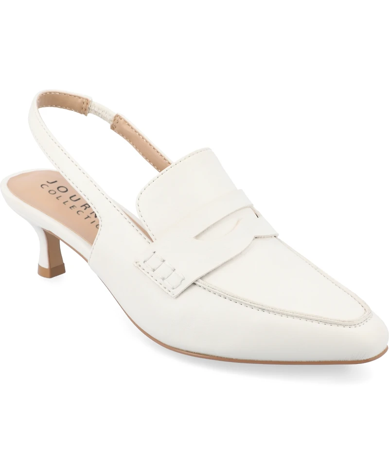 Introducing Amory by Journee Collection, the kitten-heeled loafer featuring a square-toe design with apron detail, notches at the top line, and a sling-back strap. With a low 2-in heel, Amory ensures a comfortable fit.