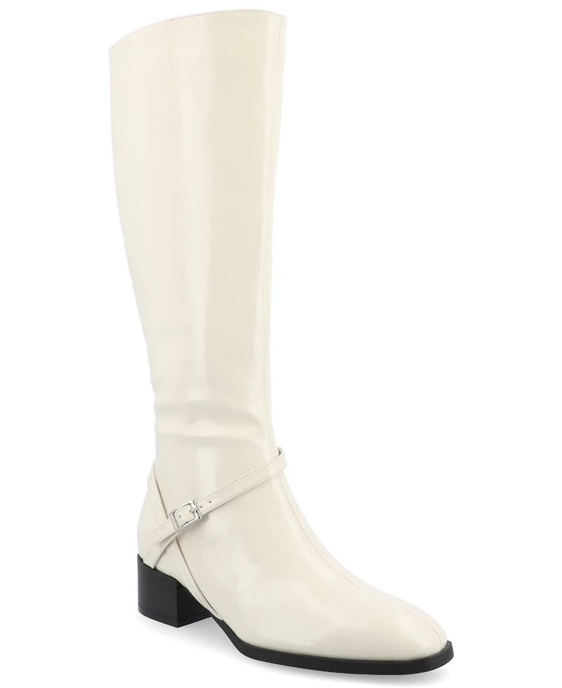 Meet the Rhianah boot by Journee Collection. These knee-high boots are perfect for both style and comfort. These boots are made with faux leather and a block heel and are ready for anything. The 4mm tru comfort foam insole ensures a cozy step, including a wide-width footbed, while the strap and buckle detail, center seam, inside zip, and square toe design add fashion and function to your look. Step out in confidence and stay on-trend with the Rhianah boot. Features a wide calf.