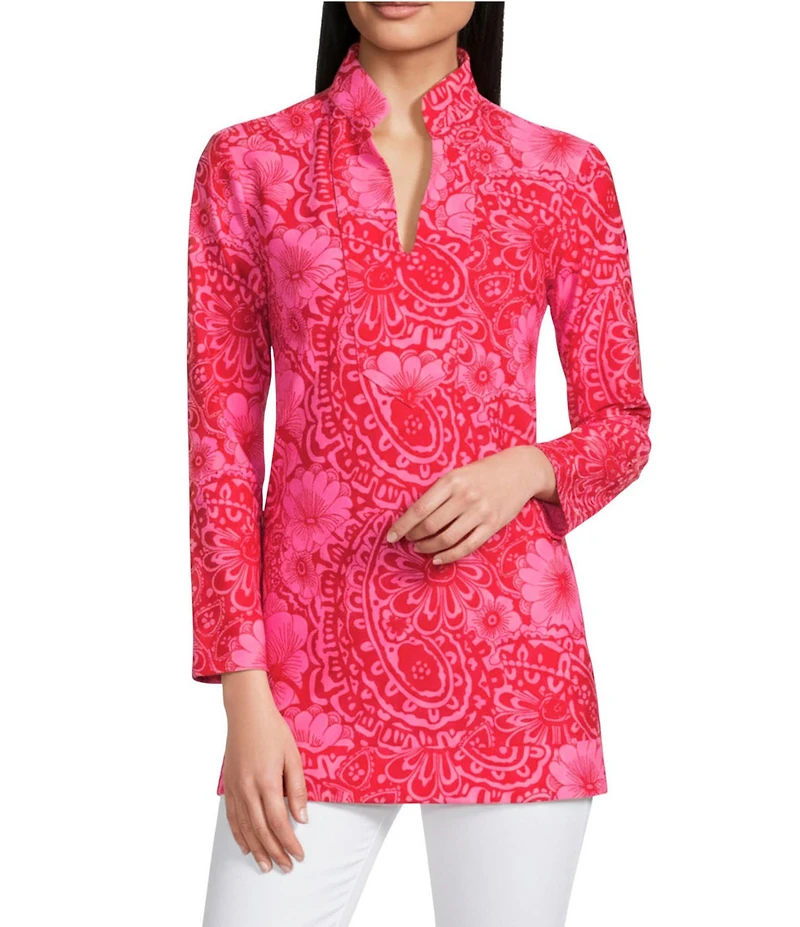 From Jude Connally, this top features: Jude cloth stretch knit wrinkle-free fabrication V-neckline with mandarin collar  Bracelet length sleeves Painted paisley print Straight hemline with side slits Pullover construction Approx. 29.25" length Nylon/spandex Machine wash/line dry Made in the USA.