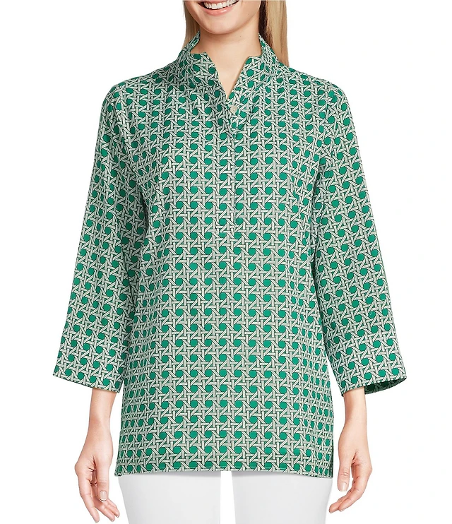 Jude Connally Hadley Bamboo Lattice Print Jude Cloth Knit Point Collar Long Split Roll Cuff Sleeve Coordinating Tunic