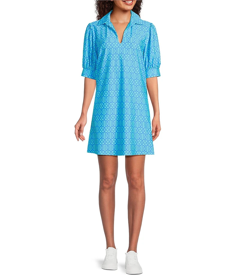 From Jude Connally, this dress features: Ultralight Jude cloth woven fabrication Bamboo dot seaglass print Drape crew neckline Cap sleeves Side slits Pullover construction Approx. 23.375" length Nylon/spandex Machine wash/tumble dry Made in the USA.