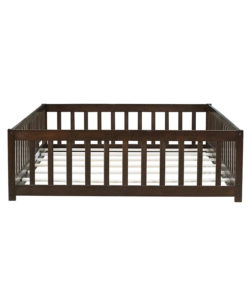 This full-size floor bed with safety fence is the ideal choice for creating a safe, playful, and independent sleeping space for your child. Designed to support both rest and play, it helps toddlers transition smoothly from co-sleeping to their own bed while offering a protected area for climbing, learning to walk, and imaginative exploration. Crafted from durable rubber wood and plywood, it ensures a sturdy and healthy environment. The fully enclosed fence with a secure revolving door provides peace of mind, while the low-profile design saves space in compact rooms. Easy to assemble with all hardware and instructions included, this floor bed combines safety, functionality, and thoughtful design—perfect for growing kids.