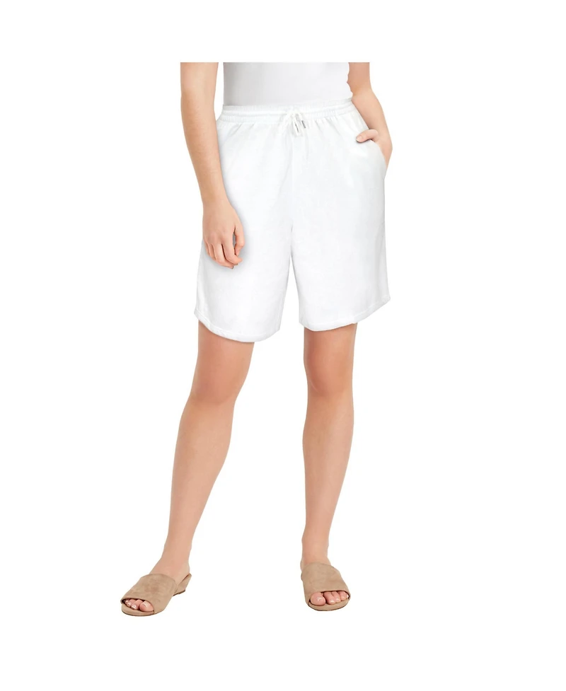 Featuring an elasticized waist with a functional drawstring, these summery Bermuda shorts prioritize comfort and style in equal measure. An elongated inseam provides thigh coverage that will keep you comfortable on long walks and busy days. 9" inseam. Baby French Terry. Machine wash. Imported