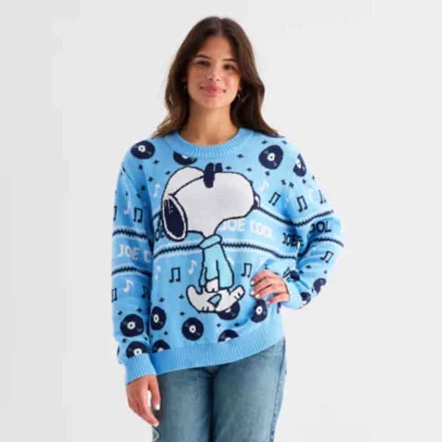 Juniors Womens Crew Neck Long Sleeve Peanuts Snoopy Pullover Sweater