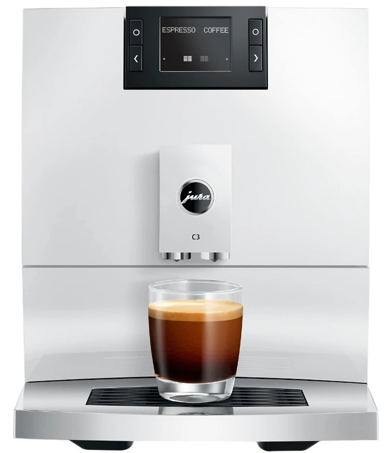 C3 Powerful yet compact, the C3 is designed for those who savor the essence of coffee in its most authentic form. Equipped with a full-size brewing unit and JURA s Professional Aroma Grinder (P.A.G.), it prepares black coffee specialties with rich flavor and complex aromas in every cup. The innovative Pulse Extraction Process (P.E.P. ) optimizes extraction time, delivering barista-quality espresso with a dense, velvety-soft crema, from mild to strong. For added convenience, the C3 features a dual-cup function, which prepares the selected beverage in two cycles, making it easy to share the perfect brew. Inspired by JURA s premium segment, the C3 echoes the timeless wave design on the convex-concave front panel, wave-inspired water tank and a chrome cup grille. Ideal for kitchens of any size, the C line is JURA s most compact footprint, measuring 10.2 x 12.8 x 17.2 in. These design elements allow coffee enthusiasts to enjoy the visual sophistication of JURA s luxury models in the premium economy class. Ease of use is central to the C3 experience. Its intuitive Easy Control Panel is operated with just four buttons, streamlining the brewing process without compromising quality. 4 pure-coffee specialties: Espresso, 2 x Espresso, Coffee, and 2 x Coffee Easy Control Panel with text display for intuitive operation Professional Aroma Grinder guarantees ideal grinding results Intelligent Pulse Extraction Process (P.E.P.®) Intelligent Water System (I.W.S.) with RFID technology automatically detects the CLEARYL Smart+ water filter Dual cup function for preparing specialties in two cycles Timeless, compact design inspired by top-of-the-range wave design Compatible with Wi-Fi Connect V2 for use with J.O.E.® (JURA Operating Experience) app Wi-Fi Connect V2 is not included with the purchase of C3 Measuring Approx. 10.2 x 12.8 x 17.2 in Imported