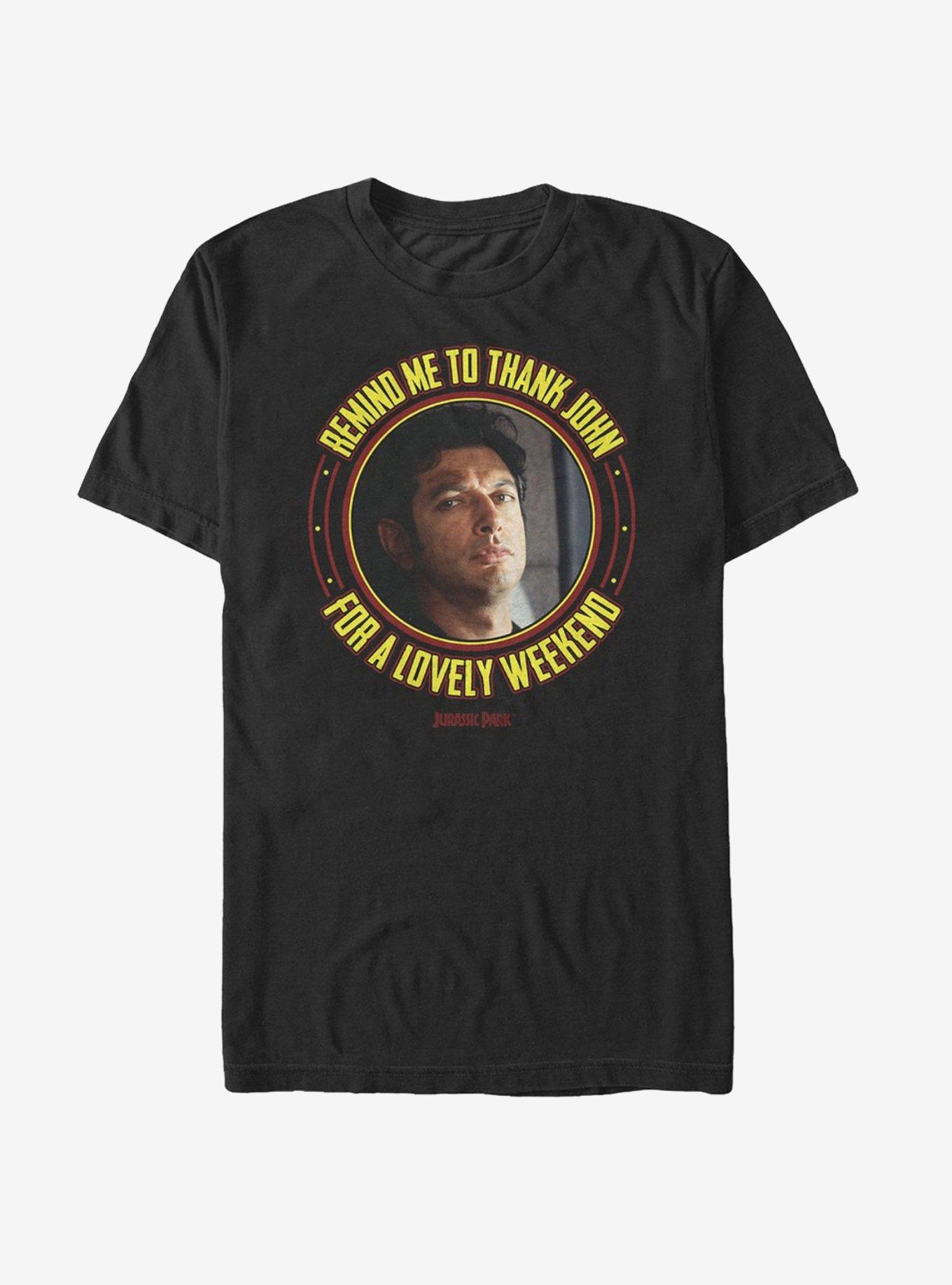 If you were lucky enough to get out alive, you'll need this black Jurassic Park tee! Featuring Dr. Ian Malcolm's quote "Remind me to thank John for a lovely weekend"in yellow around a graphic of the beloved chaotician.