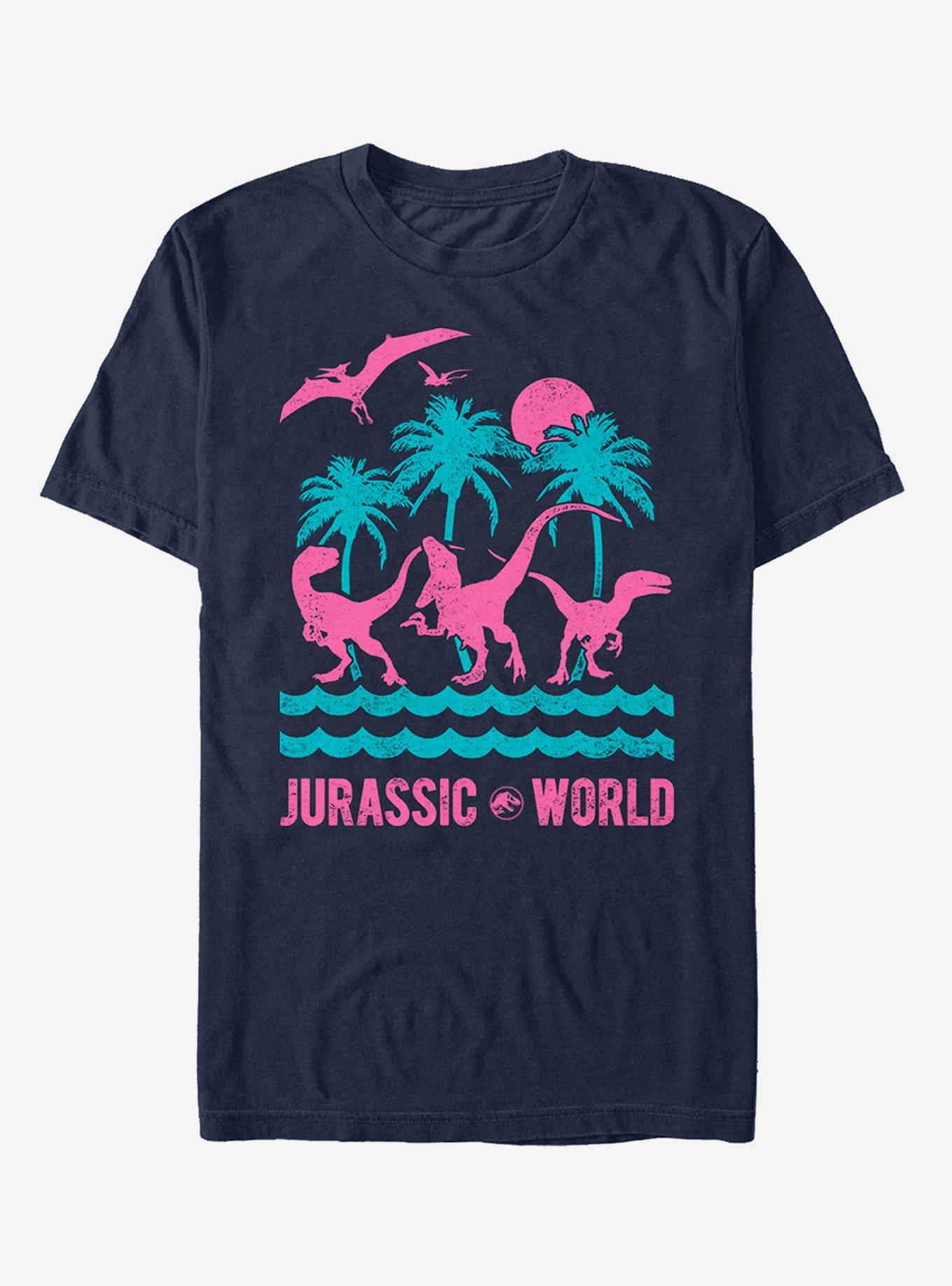 Heading to Jurassic World wasn't quite the vacation you thought it would be...so treat yourself to this tee! Featuring a retro tropical print of dinosaurs and palm trees in bright turquoise and pink.